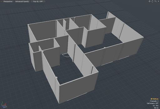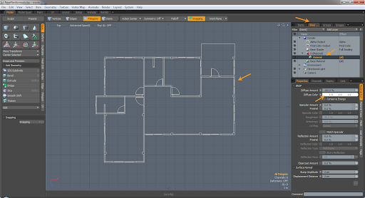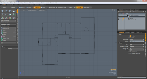 7. ขึ้นโมเดลจากเส้นโดยใช้เครื่องมือต่างของ modo ภาพด้านล่างผมใช้ไฟล์ที่แปลงมาจาก AutoCAD เป็นแบบ แล้วใช้เครื่องมือ Pen สร้างพื้น สร้างโปรไฟล์ของเสาและผนัง (เราสามารถที่จะดึงเส้นขึ้นมาเป็นพื้นผิวได้ด้วยเครื่องมือ Extend ได้เลย เพียงแต่อาจจะทำให้ต้องปรับแต่งงานเยอะ เพราะพื้นผิวด้านหน้ากับด้านหลังมันจะสลับกันจนทำให้งงได้) โดยแยกเลเยอร์ให้เป็นระเบียบ และใช้เครื่องมือ Ticken ดึงพื้นผิวขึ้นมาเป็นรูป จากนั้นเจาะช่องประตูและหน้าต่างด้วยเครื่องมือ Slice, Loop Slice และ Bridge และใช้คำสั่งอื่นๆอีกเล็กน้อยเพื่อจัดตำแหน่งให้ถูกต้อง