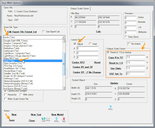 4. ในส่วนของ Center Point คลิกเช็กให้มีเครื่องหมายที่ Adjust ในส่วนของ Output Scale Factor นั้นจะเป็นส่วนสำหรับกำหนดขนาด ซึ่งถ้า Scale ถูกต้องก็ไม่จำเป็นต้องปรับค่าอะไร ในส่วนของ Save File Type ให้เลือกเป็น modo (*.lxo) เสร็จแล้วคลิกปุ่ม Save